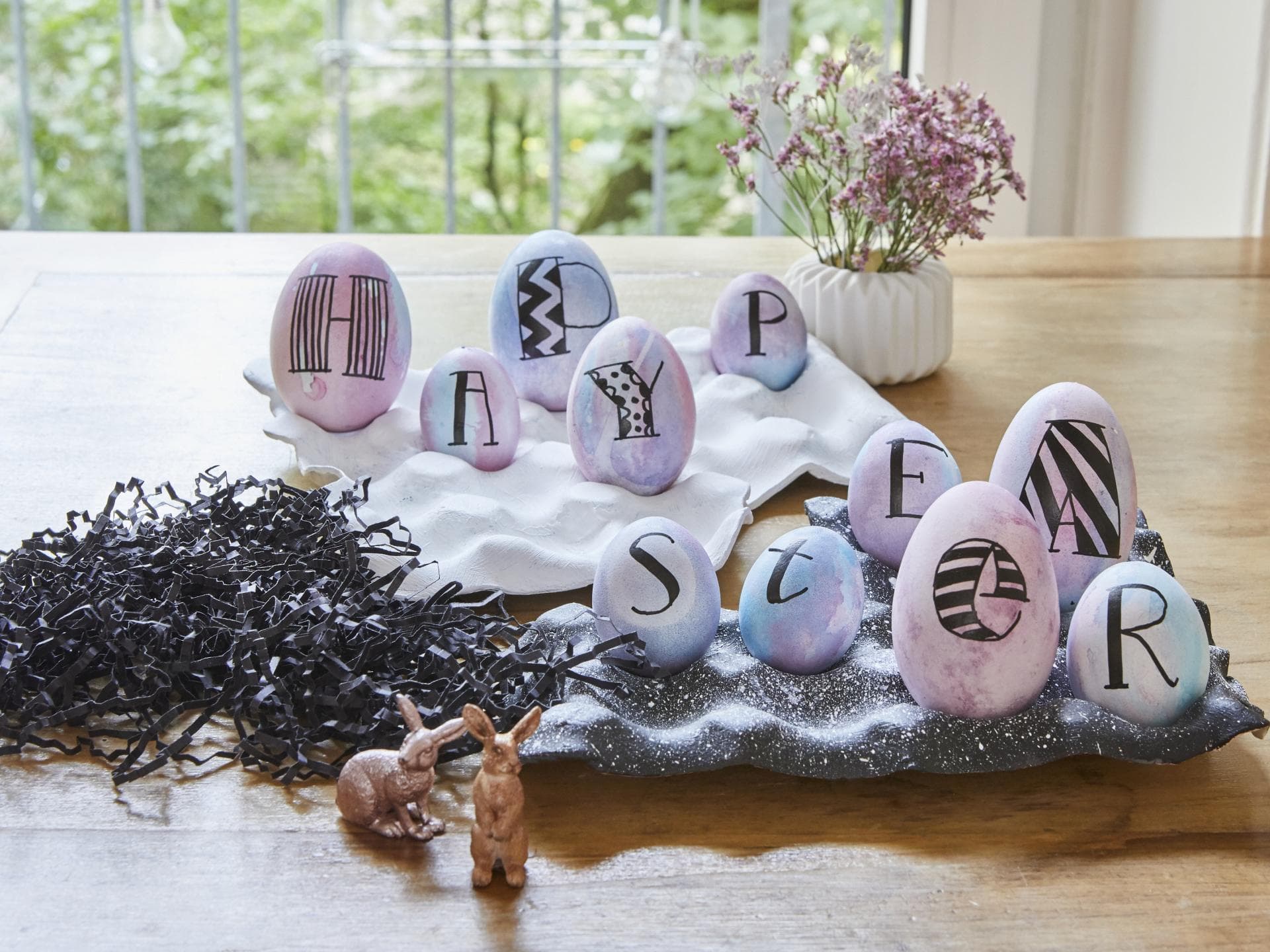 Statt Ostereier klassisch zu färben, könnt ihr auch mal diese Handlettering-Optik ausprobieren. So könnt ihr direkt noch eine Botschaft mitsenden.
