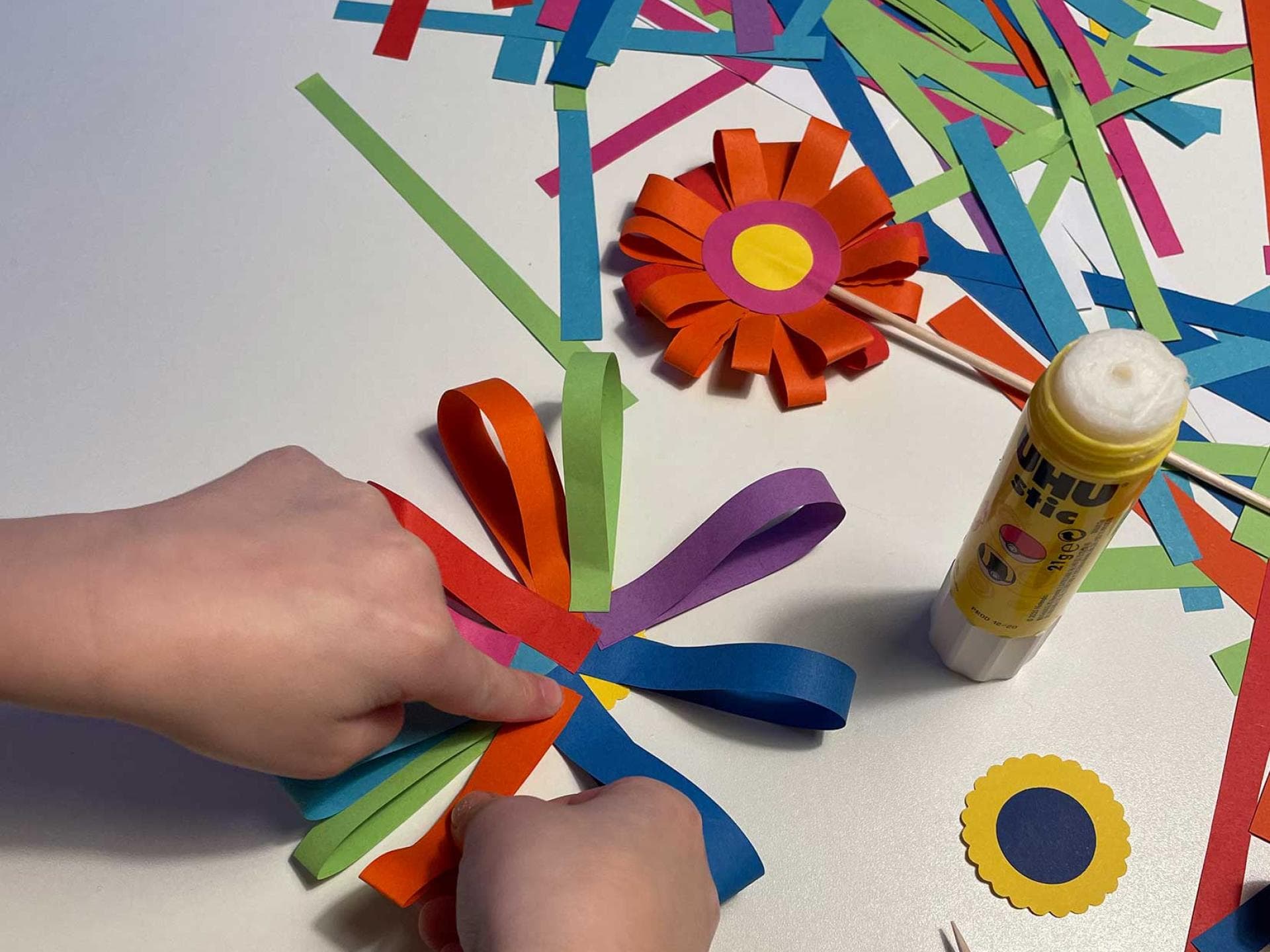 Wird gern in Kitas gebastelt: Die ganze Hand auf ein buntes Papier setzen und umranden. Das Kind kann nun fleißig ausschnippeln und die Hand dann an einen grünen Stängel oder an einen Strohhalm kleben, als Blüte.