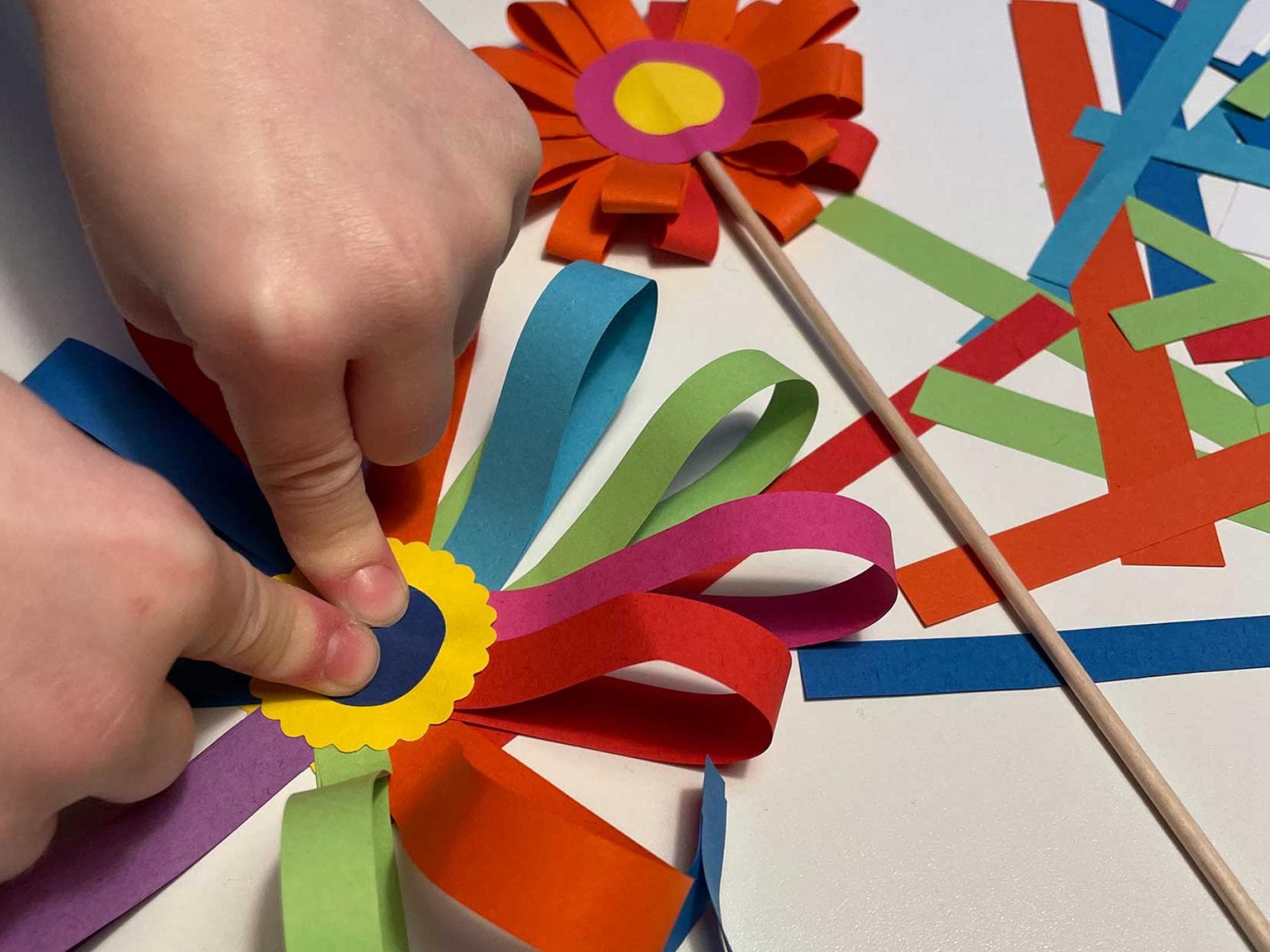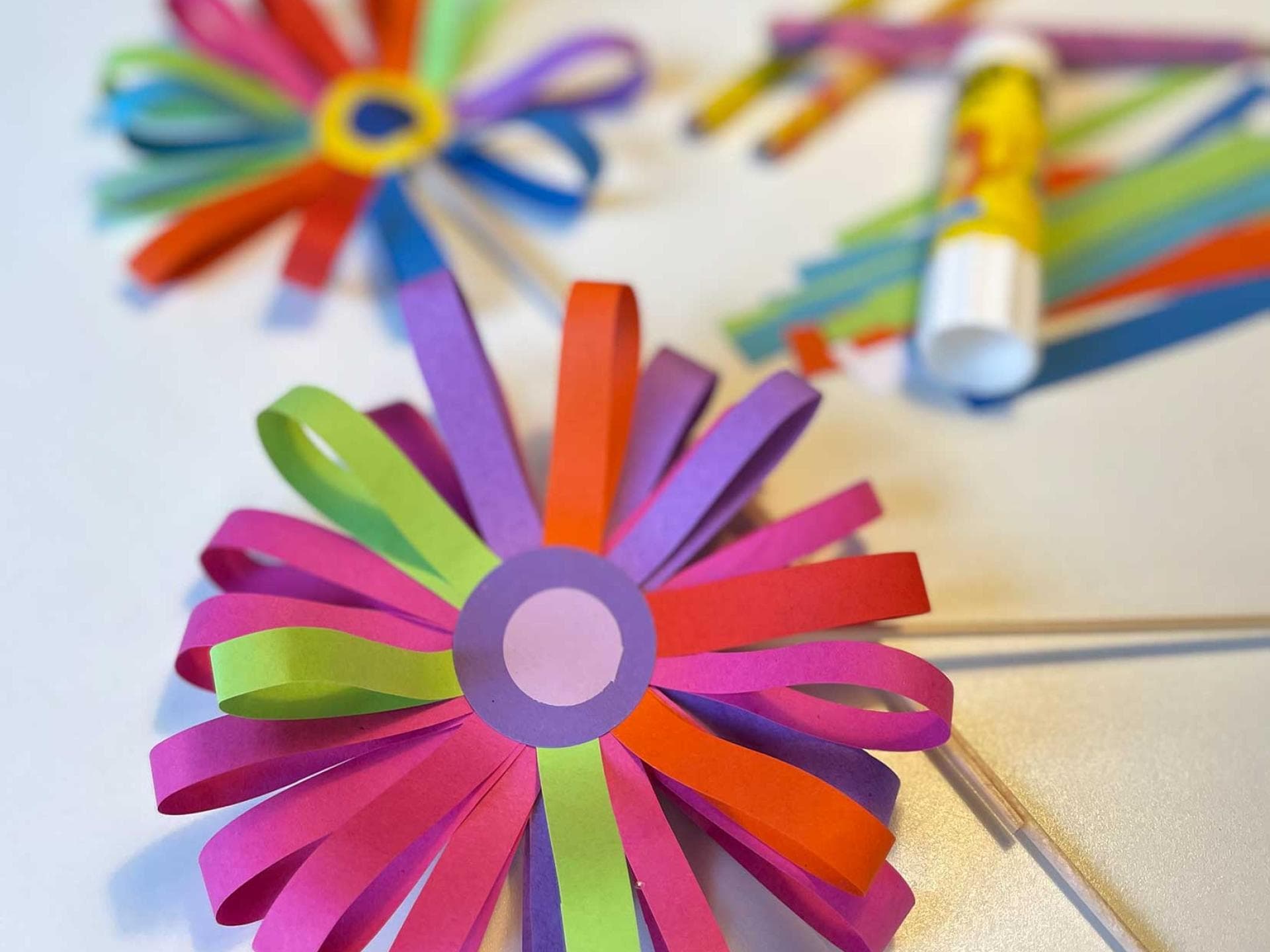 Ihr braucht lediglich ein Stück grünes Papier, dreht es diagonal ein. Am Ende klappt ihr es mit doppelseitigem Klebeband zu. So entsteht der Stiel. Für die Blüten: Wählt buntes Papier, das ihr quer einschneidet. Die Schnipsel werden mit einer Schere vorsichtig gezwirbelt. An die Längsseite klebt ihr wieder einen Streifen doppelseitiges Klebeband und befestigt das Ganze rund um den Blumenstiel, wie in diesem Video zu sehen:
