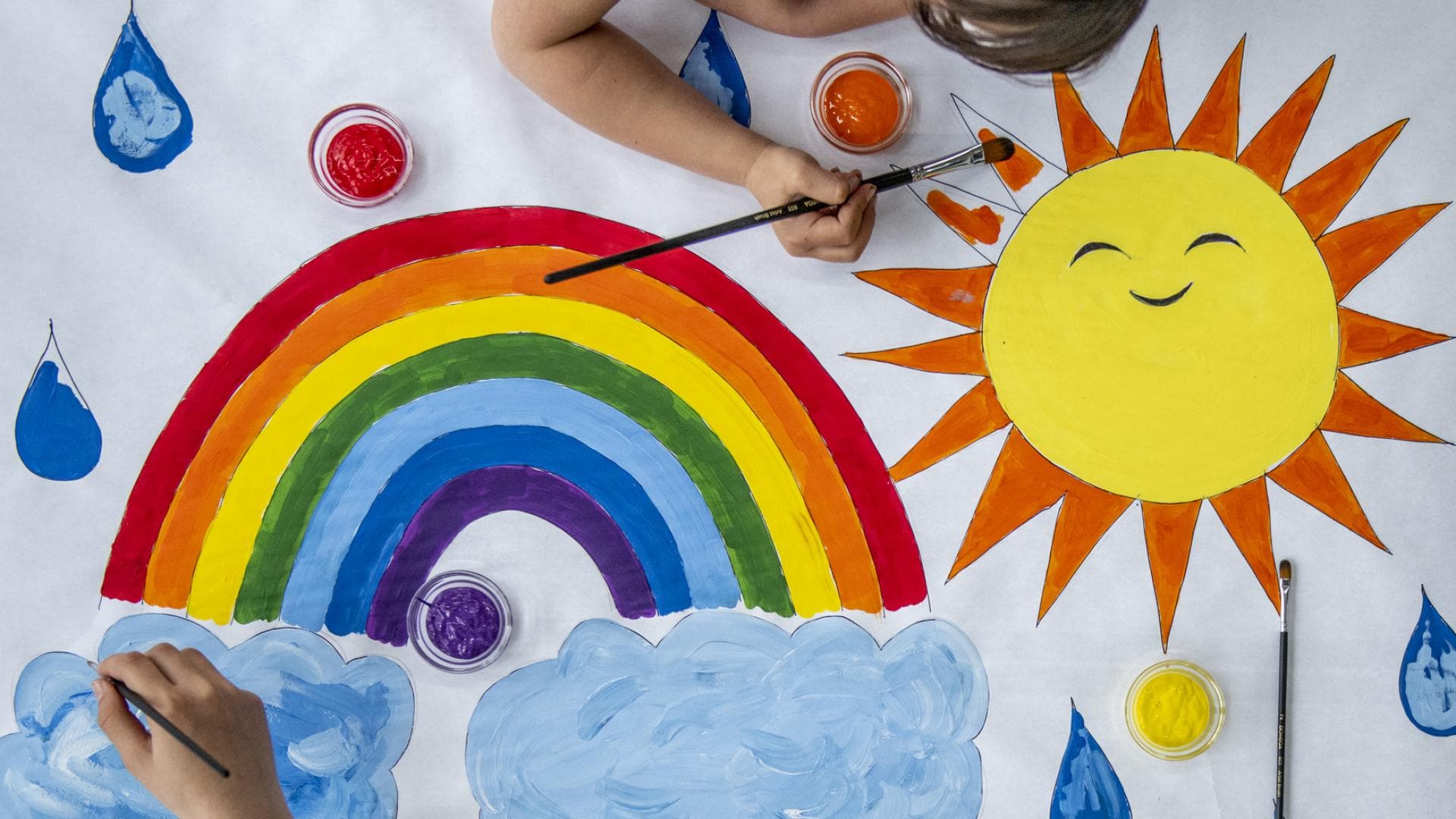 - Wolken mit Bastelkleber auf die Enden des Regenbogens aufkleben.