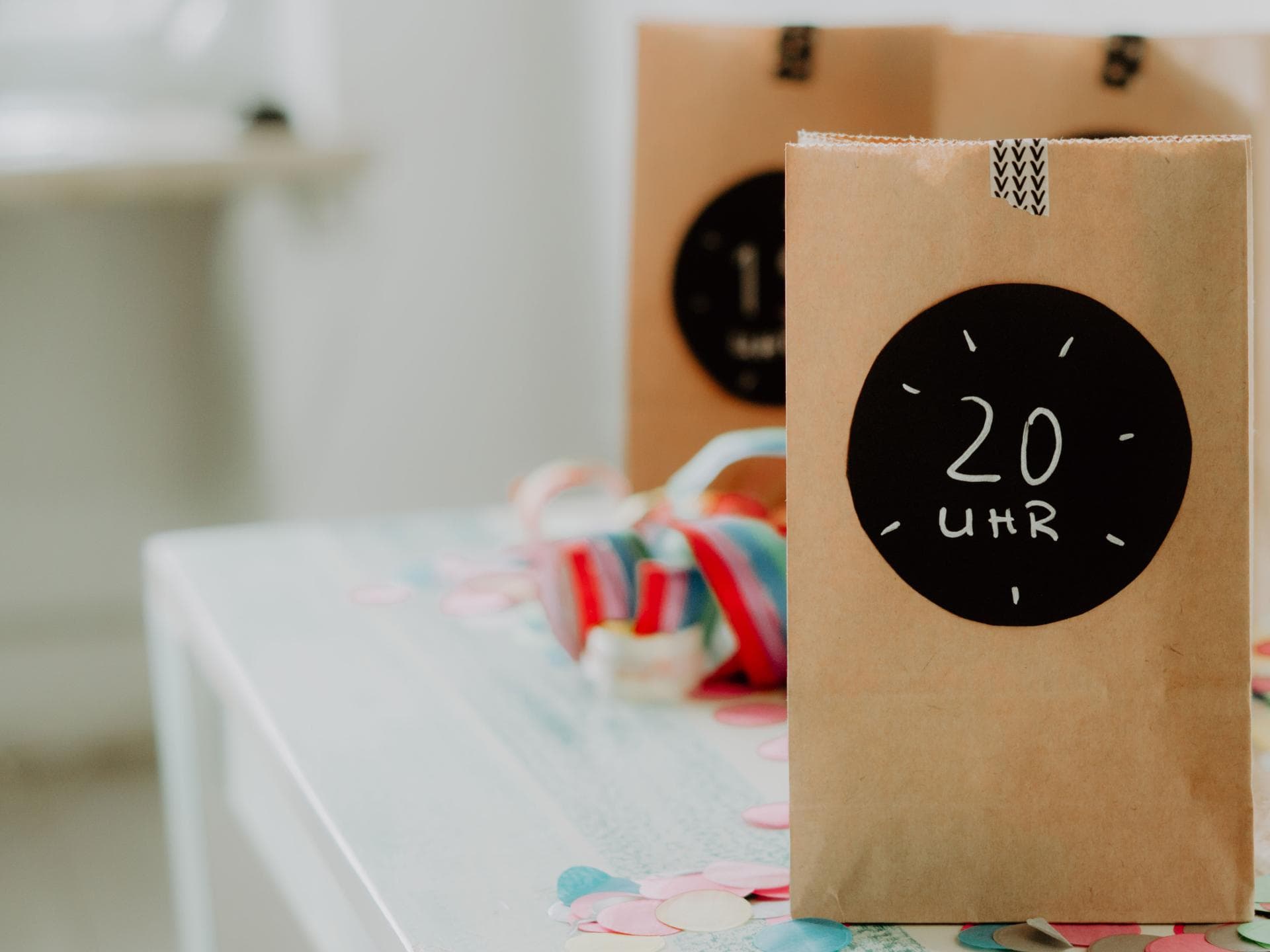 Noch mehr Action als der Luftballon-Countdown bringen kleine Stundentüten, die mit allerlei Kleinigkeiten gefüllt werden. Stündlich (oder auch halbstündlich) dürfen eure Kinder eine Tüte öffnen und schauen, welche Aufgabe sie bis zur nächsten Tüte erfüllen müssen.