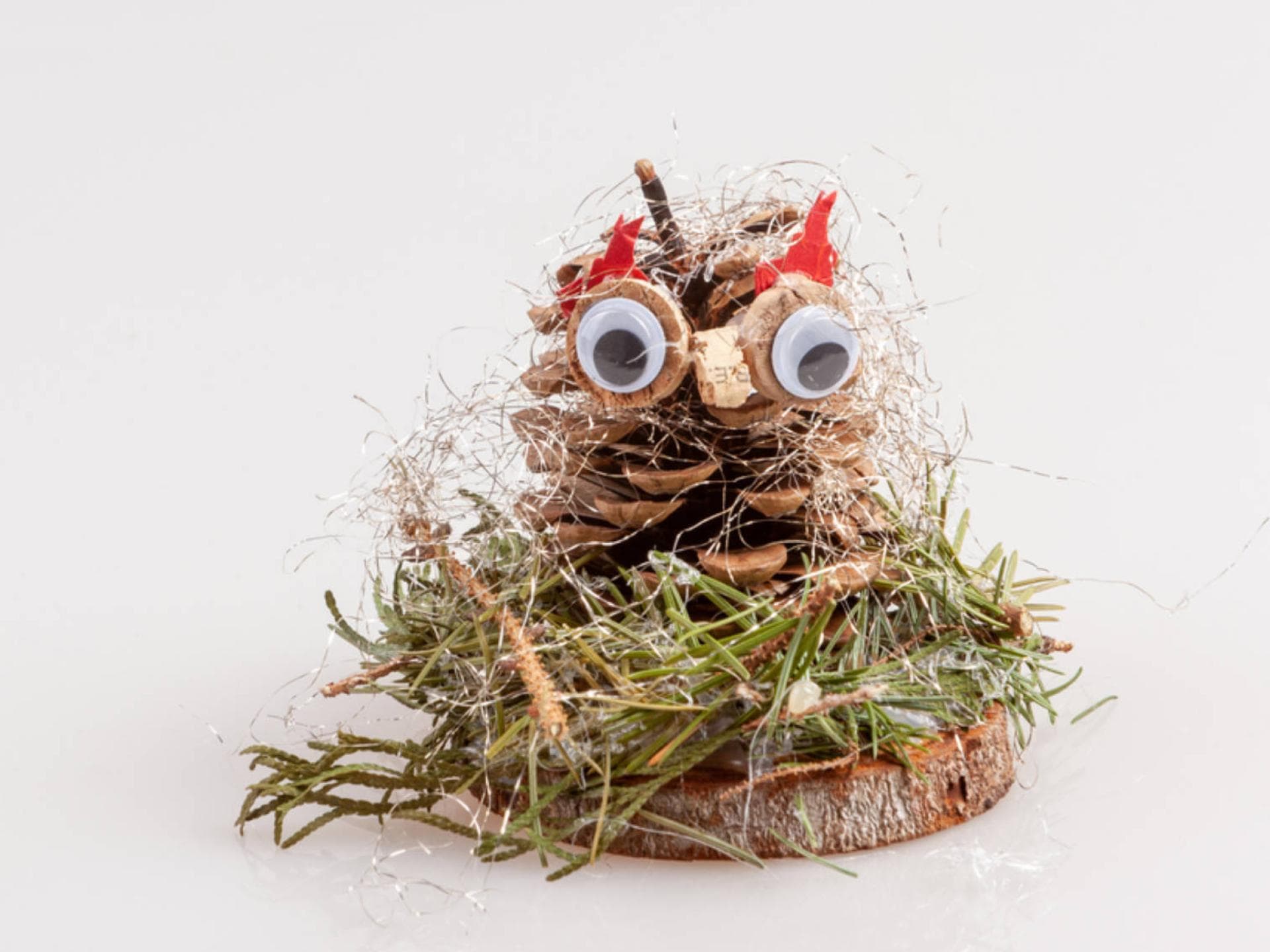 - Schritt: Die Augen (Eichelhütchen) und den Schnabel (kleinere Zapfen oder Zweigstückchen) festkleben. Wer Lust auf Wackelaugen hat, setzt auch diese noch oben drauf.