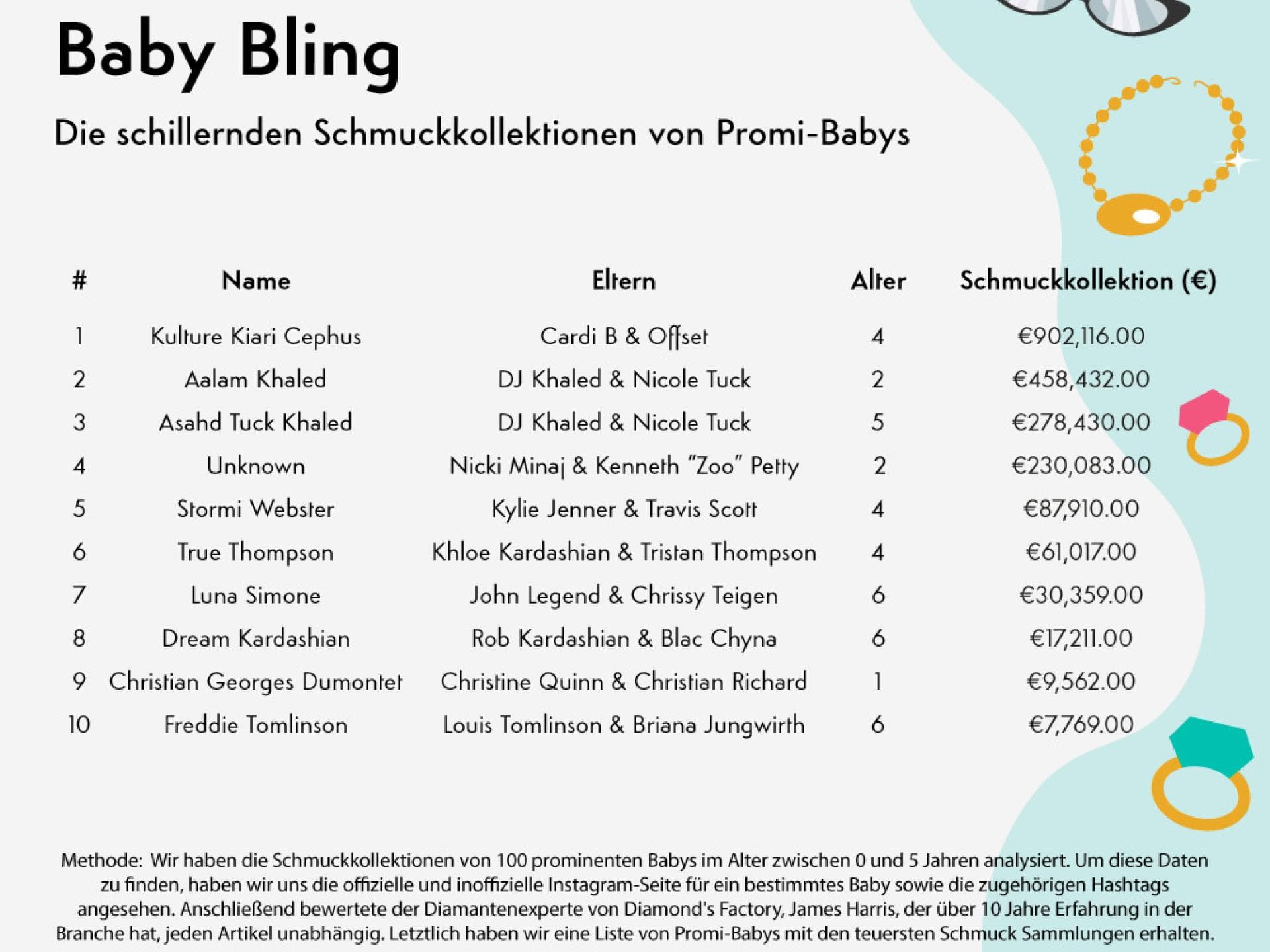 - Kulture Kiari Cephus (geboren im Juli 2018), Töchterchen vom Rapper-Pärchen Cardi B und Offset, führt die Liste an. Ihre Schmuckkollektion hat umgerechnet einen Wert von fast einer Million Euro. Sagenhaft.