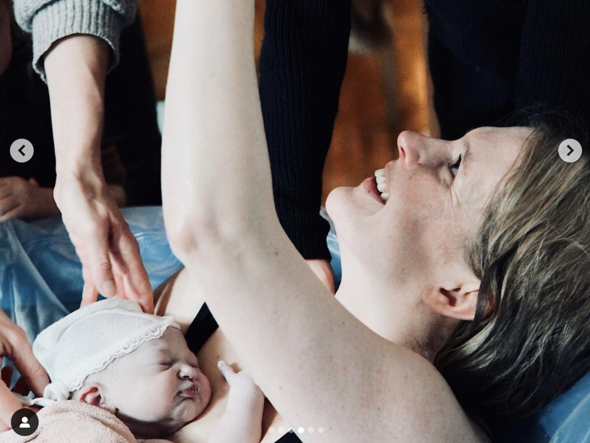 Ich hatte es mir so gewünscht und wollte einfach genau hier unser Baby im Kreise meiner Liebsten und mit Blick auf mein Wochenbett empfangen! Mein Muttermund war auch tatsächlich schon komplett geöffnet, ich habe selbst mituntersucht und dachte nur, dass der Kopf noch viel zu hoch ist. Ich kam noch um die Symphyse (das Schambein) herum, und die Fruchtblase stand auch noch! Gedanklich konnte ich mich aber wieder total auf meine Wehen fokussieren und habe kaum etwas wahrgenommen, was um mich herum passierte. Ich wollte immer Melanies Hand spüren, wie sie mich einfach nur hält, mein Kreuzbein und meinen unteren Bauch gleichzeitig ... und dann habe ich sie angeschaut und leise gesagt, jetzt kommt es, in dem Moment ist auch die Fruchtblase geplatzt und nicht mal eine Minute später habe ich Pippa in meine Hände geboren ♥️