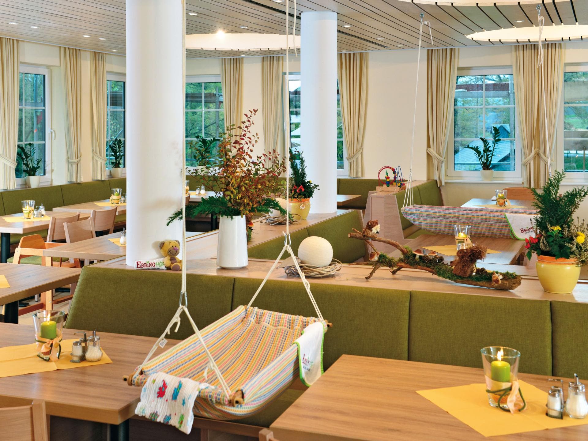 "Werdende Mütter können hier unbesorgt entspannen, denn unser Hotel ist optimal auf die Bedürfnisse von Schwangeren abgestimmt", verspricht das Familotel Ebbinghof."Speziell für alle Mütter in anderen Umständen" wird hier ein ausgewogenes Ernährungsprogramm geboten. Koffeinfreie Kaffeespezialitäten in Bio- und Fairtrade-Qualität gehören zum Service in "Deutschlands erstem Schwangeren-, Kinder- und Babyhotel". Eine neue Infrarotsauna bringt sanfte Entspannung. Auch "superbequeme Betten" mit höhenverstellbaren Lattenrosten zählt das Haus zu seinen Pluspunkten. Ein spezielles Wellnesspaket für Schwangere gibt es zwar nicht. Der größte Teil des absolut erschwinglichen Massage- und Kosmetikangebots eignet sich aber nach Hotelangaben "bestens" für werdende Eltern.