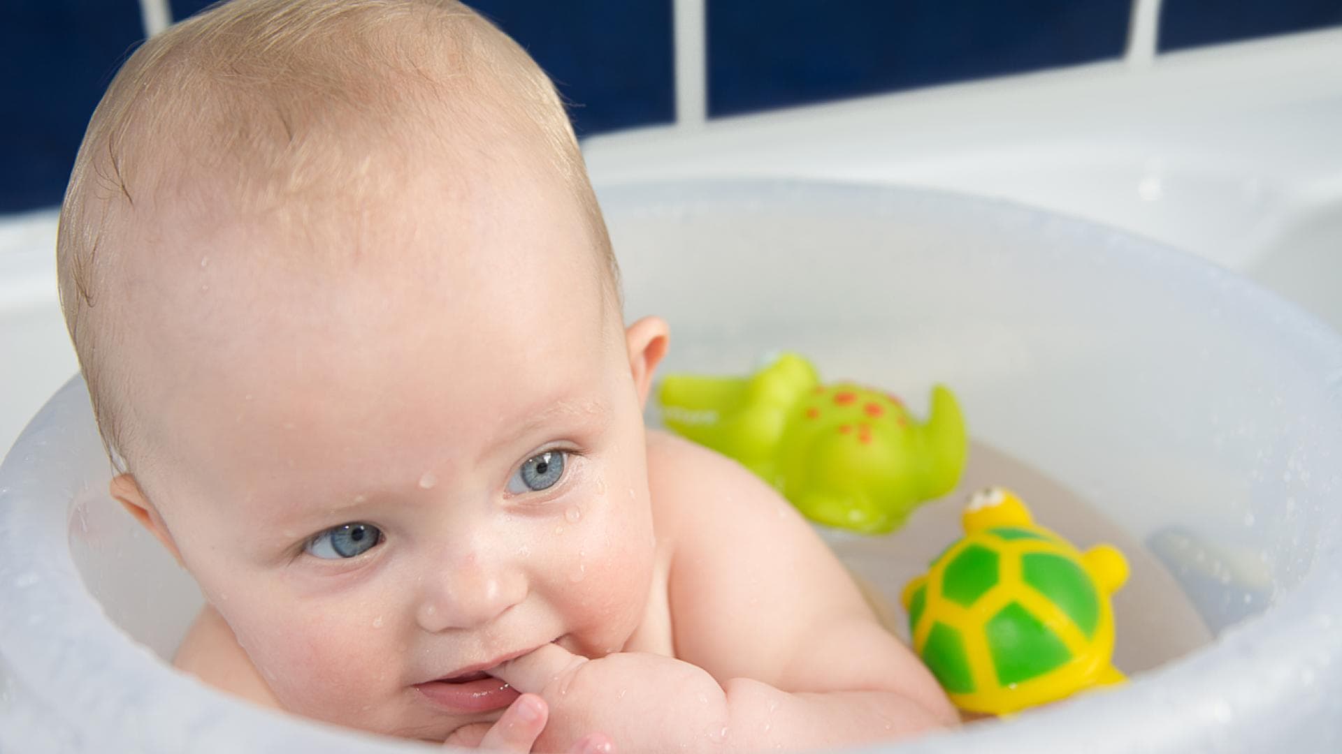 WICHTIG: Lasst euer Baby beim Baden im Badeeimer niemals allein.
